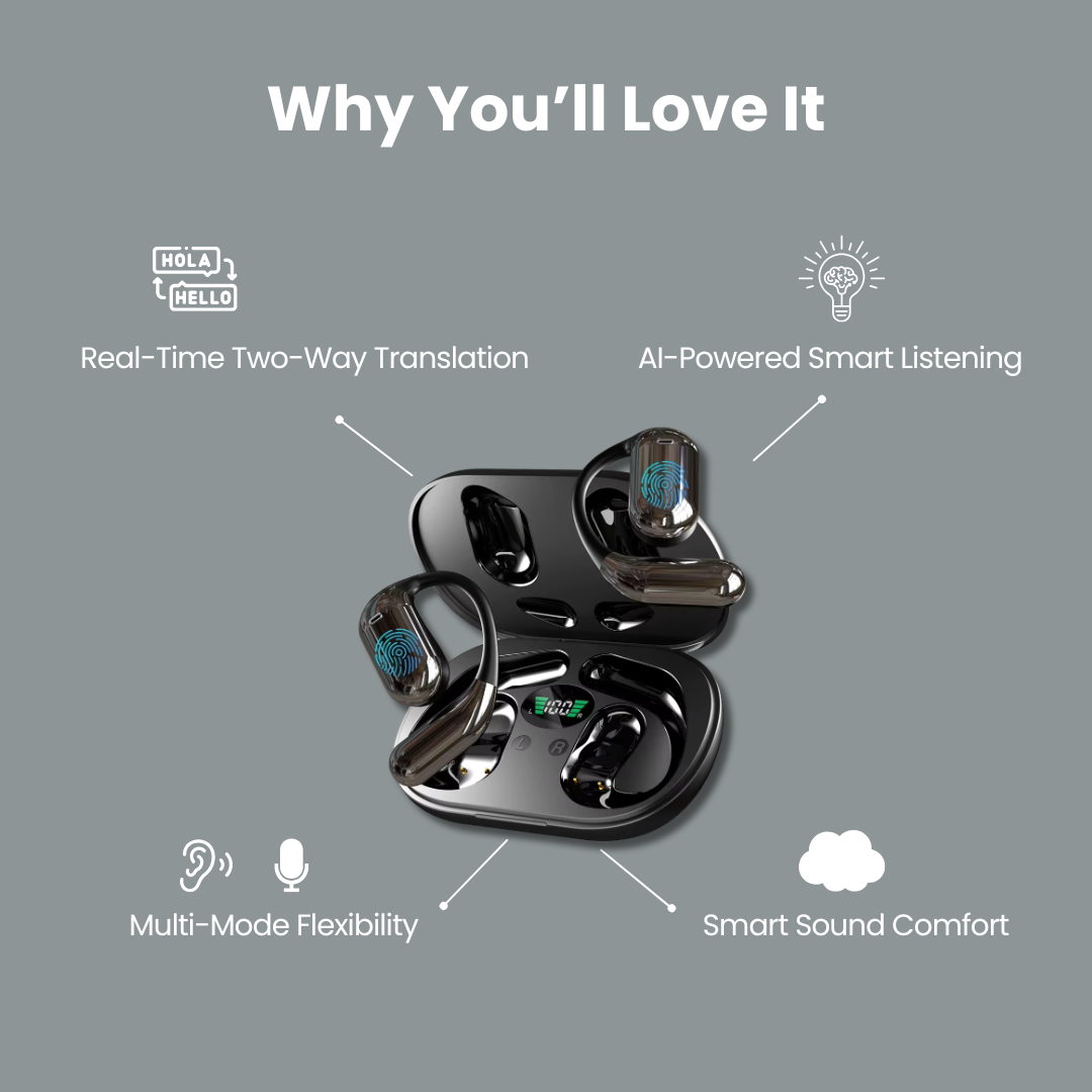 Talk, travel, and learn without limits. Wireless AI translation that fits right in your ears.